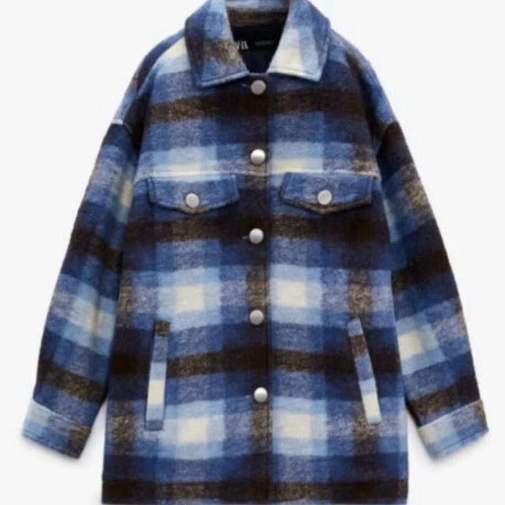 Zara Wool Blend Oversized Plaid Check Overshirt Jacket Shacket Blue Sz XS | eBay