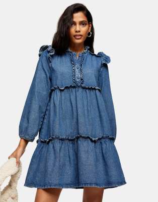 Topshop frill tiered denim mini dress