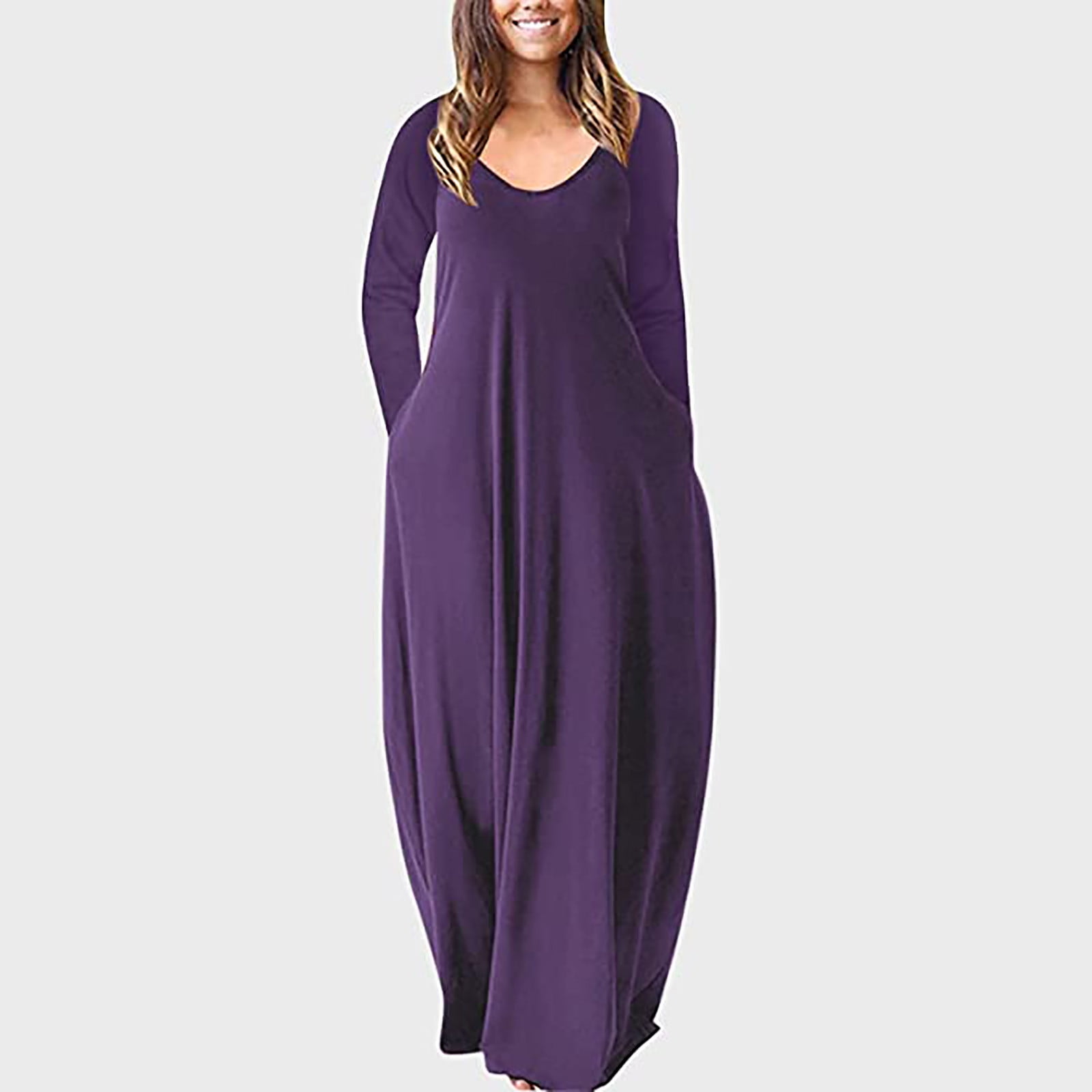 QAZXD Women's Maxi Dresses Long Sleeve Crew Neck Long Casual Dresses Loose Plain Purple M - Walmart.com
